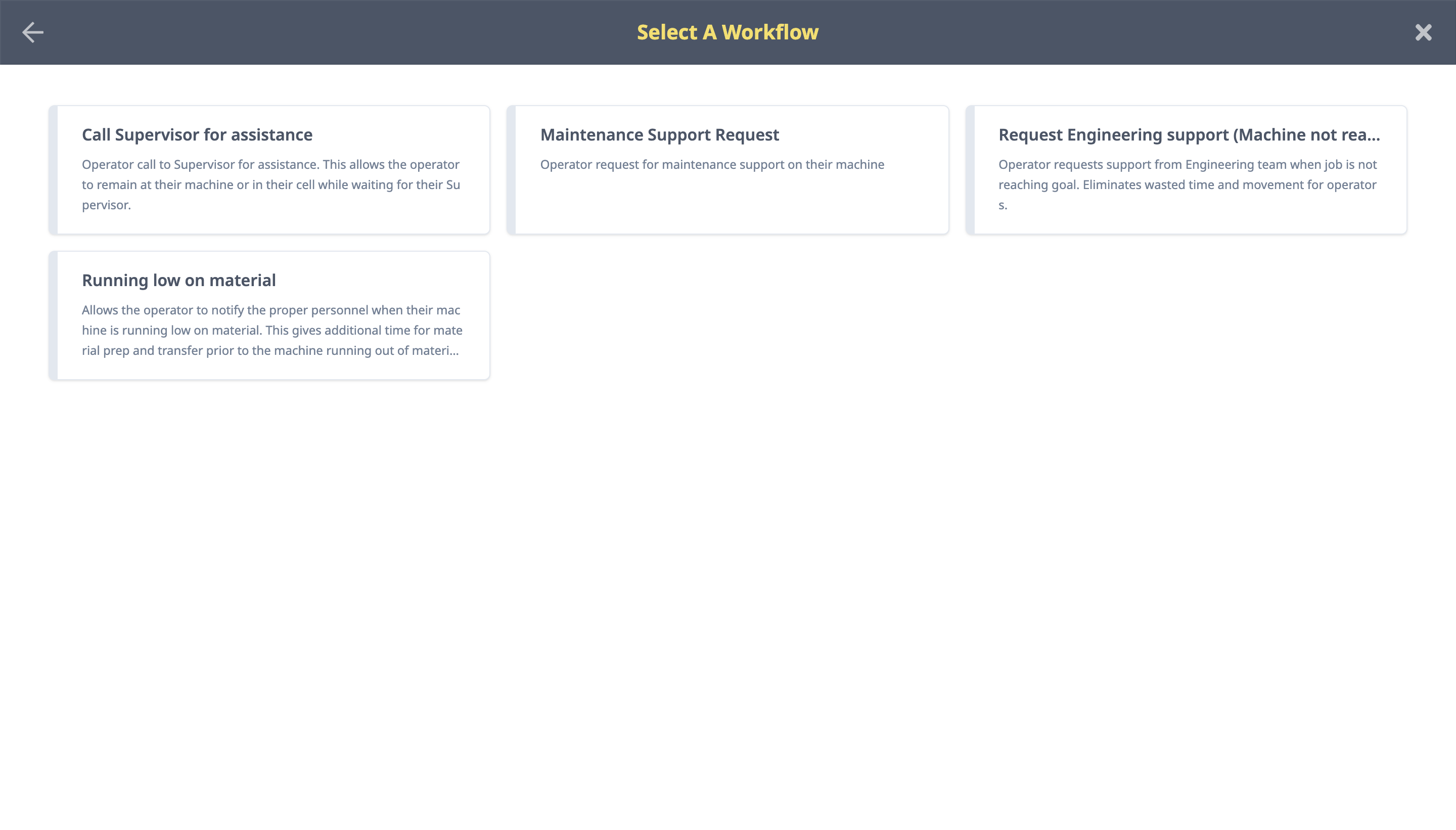 One of the simplest, but also most beneficial, use cases of manual workflows is the ability to set up a “Call for Help” button on the operator dashboard. With this type of workflow enabled, an operator can request support from a supervisor without leaving the machine. Instead of leaving the machine, risking downtime, to search for the shop floor manager, an operator can simply trigger a workflow via a tablet at the machine, which will automatically notify their manager that they require assistance.