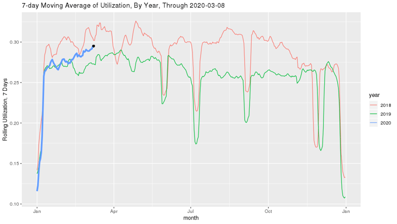 This plot shows 2018, 2019, and 2020 rolling 7-day machine utilization rate: